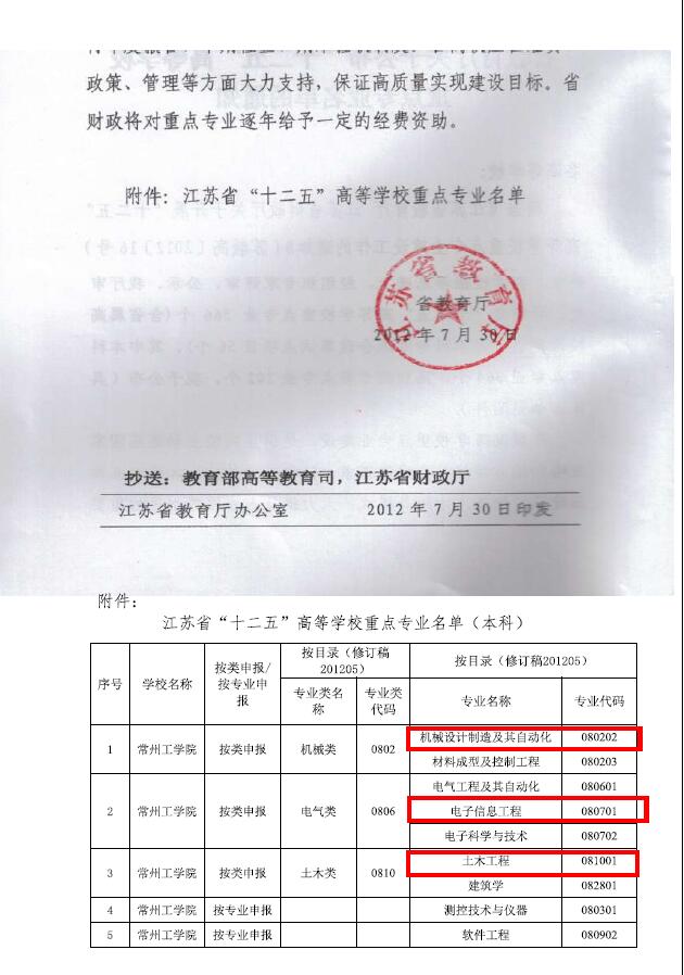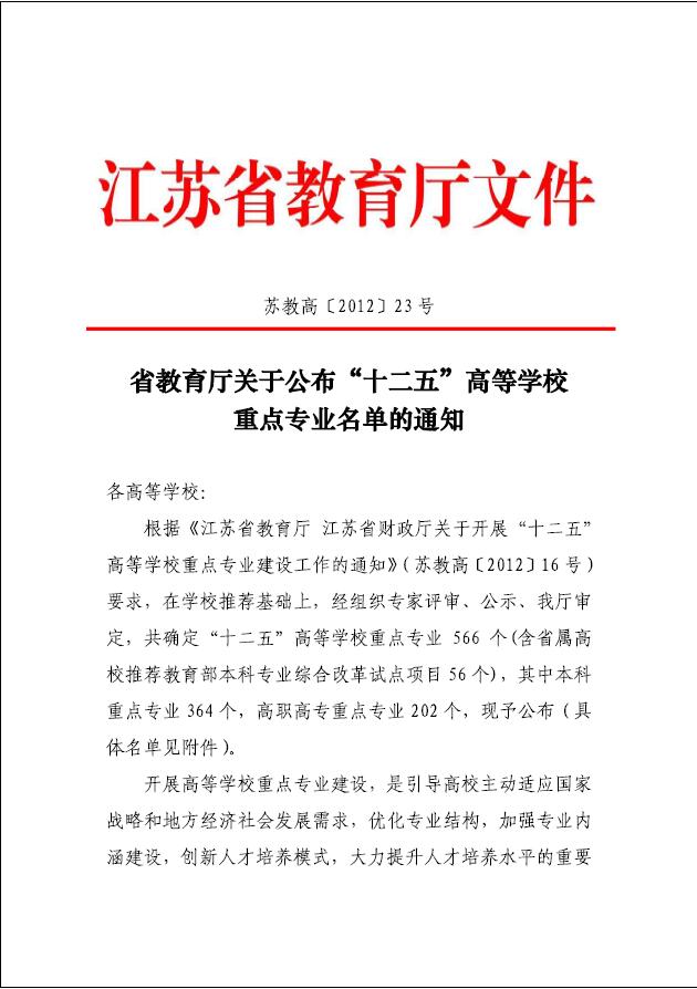 江苏省“十二五”重点专业(类):土木类、机械类、电气类