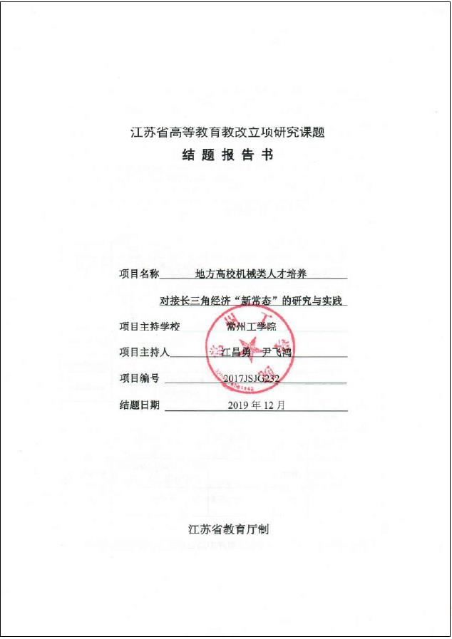 江苏省教改课题:地方高校机械类人才培养对接长三角经济“新常态”的研究与实践