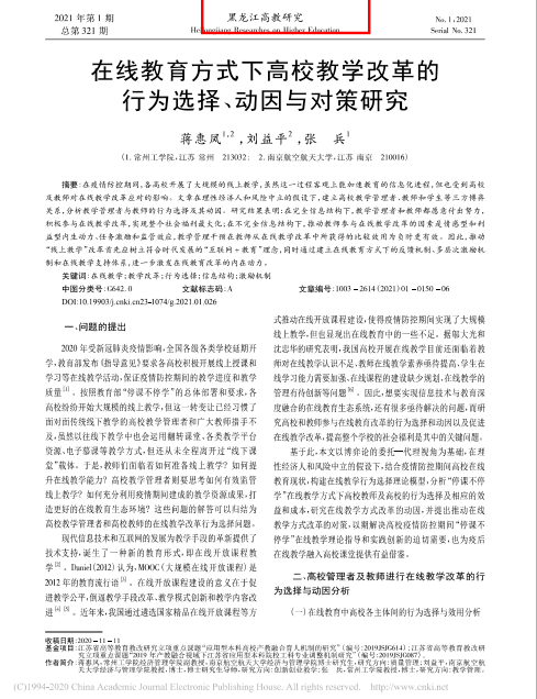 在线教育方式下高校教学改革的行为选择、动因与对策研究,《黑龙江高教研究(北大核心)》